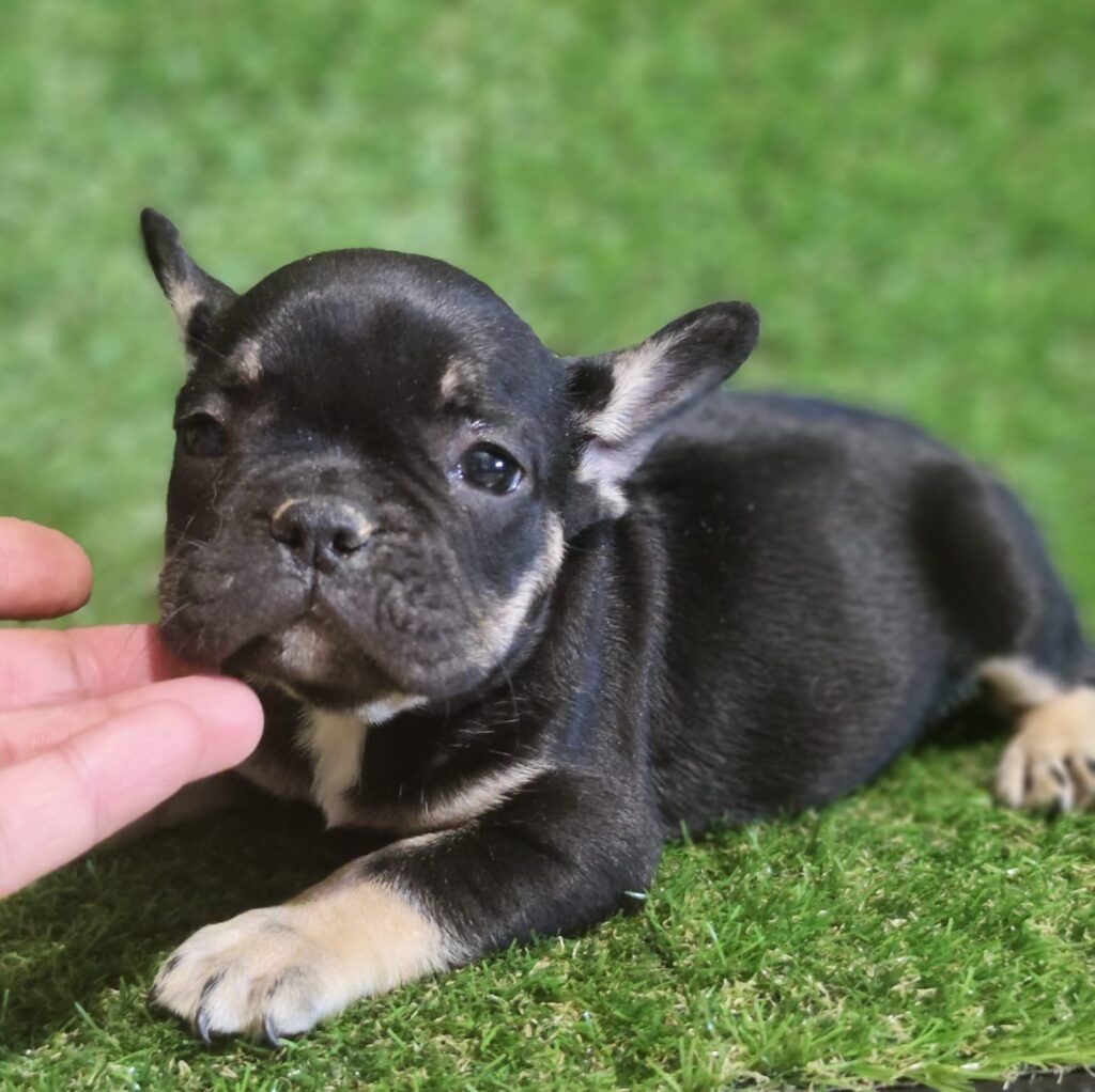 Negro y tan: El clásico «black and tan» se refiere a un bulldog francés principalmente negro con marcas de color marrón claro (tan) en áreas específicas, como las cejas, el hocico, el pecho, las patas y debajo de la cola. Este patrón de color es más común en otras razas, pero también se puede ver en bulldogs franceses.