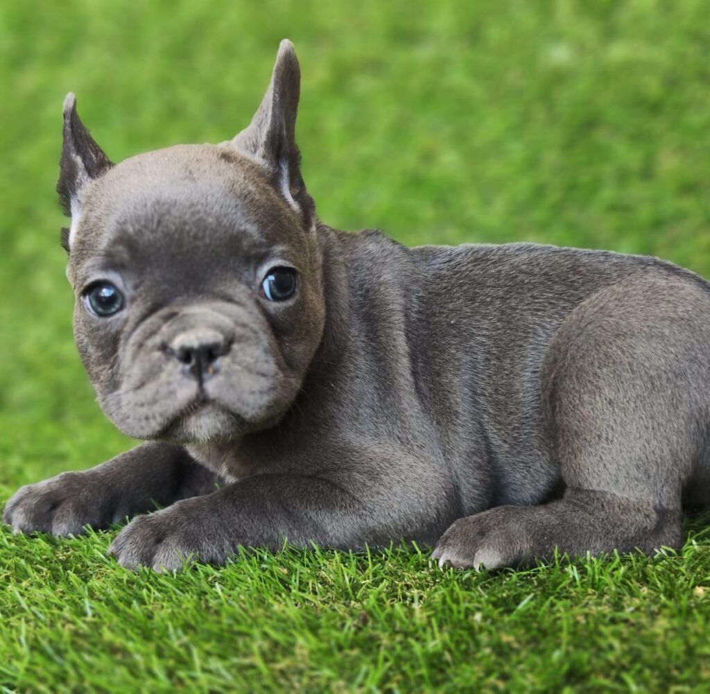 Azul (Blue): El «azul» en bulldogs franceses no es un azul verdadero, sino un gris azulado o gris acero. Este color surge por la dilución del color negro en el pelaje.
